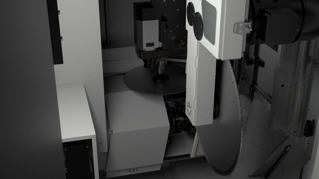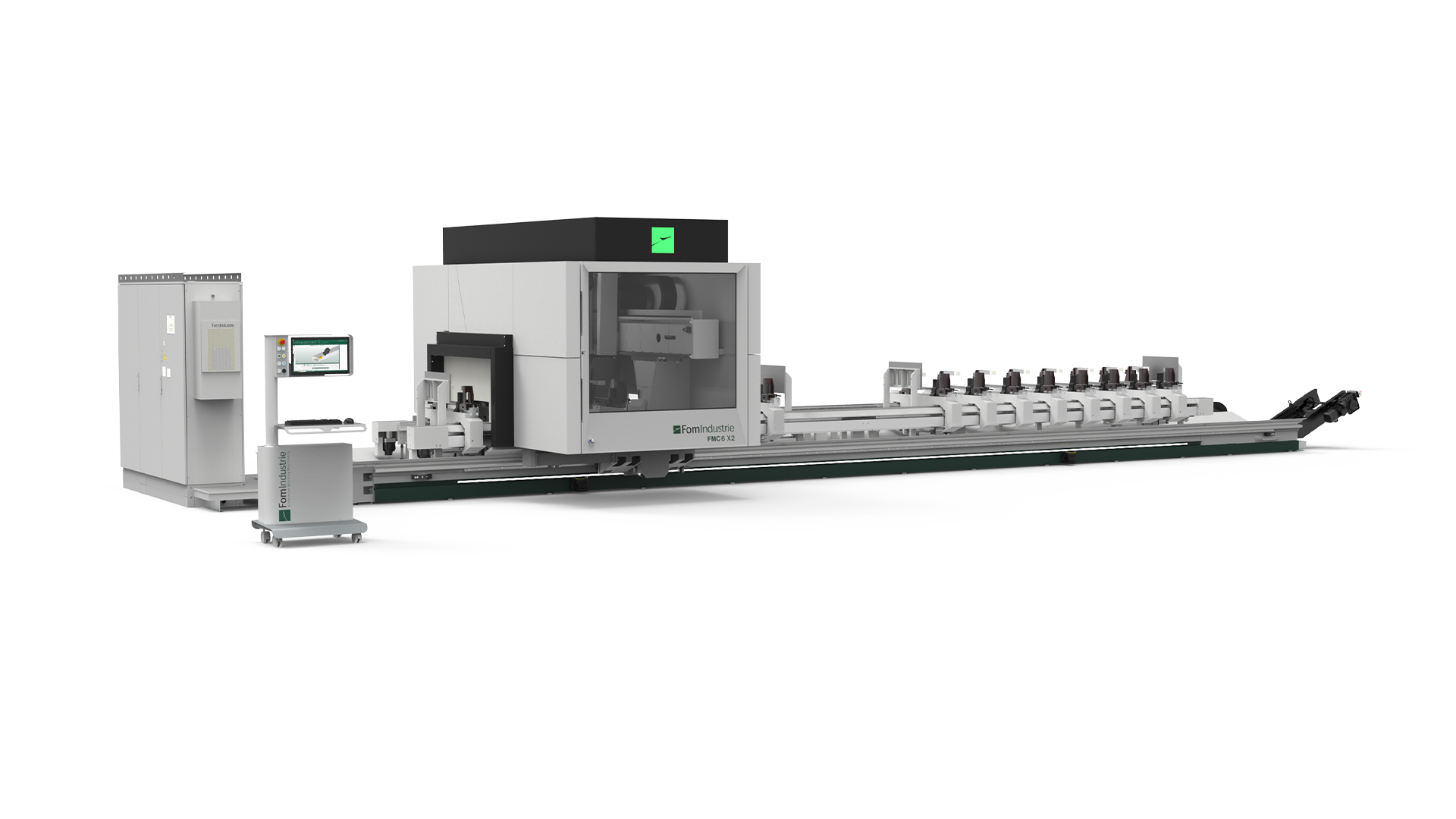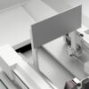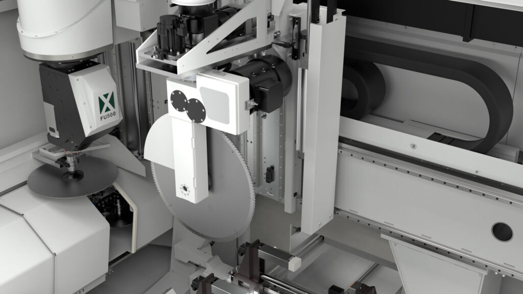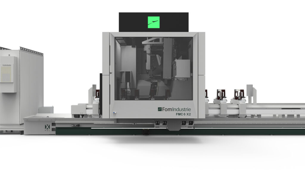 Machining centre with 5 interpolating axes for machining on 5 faces of aluminium profiles with a cross-section of 580 x 400 mm and steel tubes up to 5 mm thick. HSK E63 22 KW 24000 rpm liquid-cooled electrospindle allows the production of custom machined and milled elements. According to the configuration chosen it is possible to carry out single area, double area, pendular or multi-piece machining (up to 8 pieces with XPAL). 6 versions are available according to the length of the machine bed and whether or not cutting unit X2 is present.